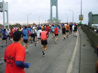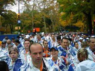 ligne de départ à l'entrée du pont de Verrazzano. Les hauts de survêtements qui